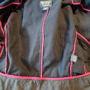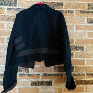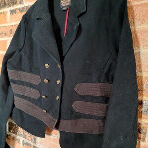 Navy blue with gray vertical bands, accents,lapel collar, double-breasted with gold-toned buttons, structured fit with slight peplum at bottom, roll back cuff sleeves, unlined. 100% cotton. Overall good vintage condition - missing 1 button.