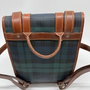 Vintage Black Watch Polo Ralph Lauren Back Pack Bag~This Ralph Lauren product represents a superb Black Watch Back Pack bag specially designed with the dual requirements of beauty and durability in mind. Crafted of sturdy cotton drill cloth and a protective vinyl shield, the two fabrics are put through a. special adhesion process which makes the fabric virtually impenetrable by water. Leather trim is of the finest French bridle leather. Handfinished with tallow wax. Lined in heavy weight canvas~inside zip pocket with Ralph Lauren leather logo plate ~ Adjustable straps~brass grommets~ Measures 10" W x 5.5" H x 4" D Stored away and used for one day~ Classic & Fabulous~Leather ID Tag attached~