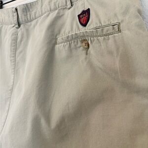 Authentic Polo Ralph Lauren Classic Golf Shorts in men’s size 42. A timeless pair of khaki cotton shorts featuring the signature Polo shield crest at the back pocket.