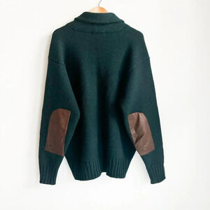 This vintage Polo Ralph Lauren sweater is a must-have for any stylish man. With its forest green wool material and leather patches, it exudes a classic, timeless look.
