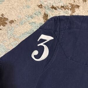 Has oil staining near bottom of shirt through front and back, one button is broken in half, small hole on back of collar, and size tag was cut out. See measurements above or in pictures for accurate sizing.