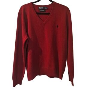 Vintage Polo Ralph Lauren Lambswool Sweater Mens Large Red V-Neck Navy Pony Logo