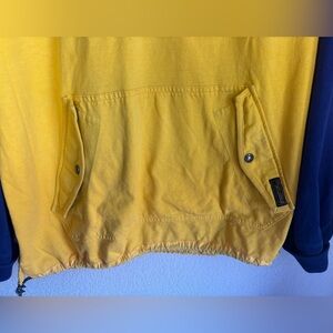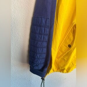 Rugby style quilted pullover hoodie. Navy and yellow colorblock. Front kangaroo and chest pockets with toggles at waist and neck. Great classic preppy piece!