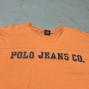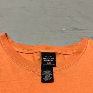Vintage Polo Ralph Lauren T-shirt in vibrant orange, featuring graphics on both the front and back. Men’s size large, perfect for a standout casual look.