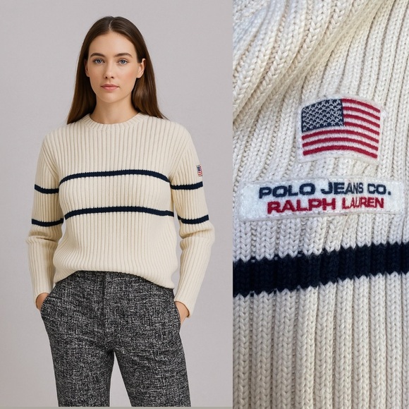 Vintage Polo Ralph Lauren Striped Sweater Chunky Knit Grandpa American Flag L
