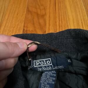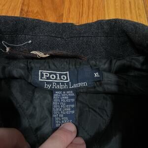 Beautiful vintage Polo wool jacket with Pony accent logo. Nice dark gray color. Some minor wear around the collar and leather hang tab in the interior is broken. Size XL. See pictures for details and measurements. Orders ship out on Monday, Wednesday, and Friday.