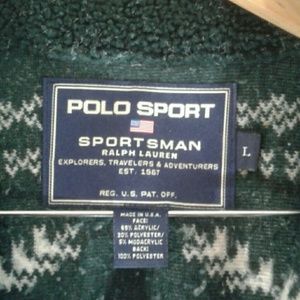 Vintage Polo Sport Sportsman Fleece Pulover in very good used condition. The leather crest on the sleeve shows some wear.