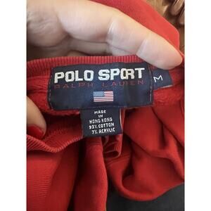 Show your American pride with this vintage Polo Sport sweatshirt featuring a bold red American flag design. This comfortable crewneck sweatshirt is perfect for sports enthusiasts and casual wear. The sweatshirt is made of high-quality material and is in great condition. It comes in size M and is suitable for regular size types. The red color and sports theme make this sweatshirt a great addition to any wardrobe.