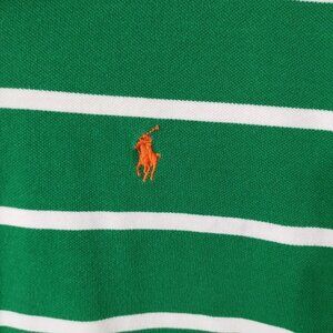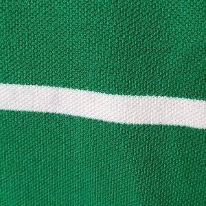 100 percent cotton, buttons are intact, vibrant green color with orange logo, good condition and quality