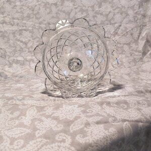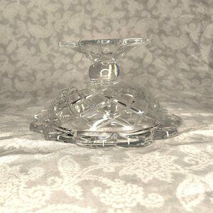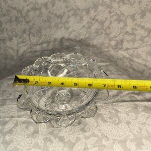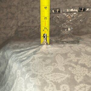 This heavy crystal pedestal dish is 7.5" wide and 4.25" tall.