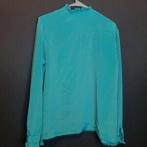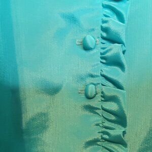 Vintage Polyester Blouse Turquoise Ruffle 70s Union Made Button Front Sz 38 Lrg