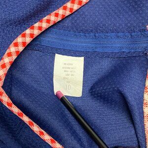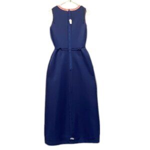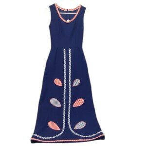 Vintage Appliqued Polyester Knit Long Hostess Dress. Lovingly worn – looks in excellent used condition. Fitted silhouette in navy blue with red and navy gingham check accents. Scoop neck in front with higher neckline back, finished in red and white check. Contouring darts on front for body hugging fit. Tank top style sleeves finished with seam tape. Waistline has beltloops, but there is no belt. Long A Line skirt has appliqued center “band” that curves at hem all the way around. Large leaf applique down front. Finished with a red and white gingham band at hem. Invisible zipper in back. Hits below ankle. Disclosure: Looking at the inside hem, dress was shortened by a previous owner. Style with platform heels, statement jewelry, or a vintage clutch for a head-turning look.