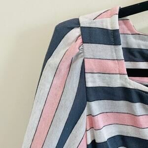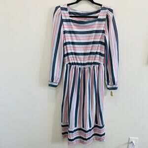 Pink, white, and blue horizontal stripes up top and vertical strips on skirt