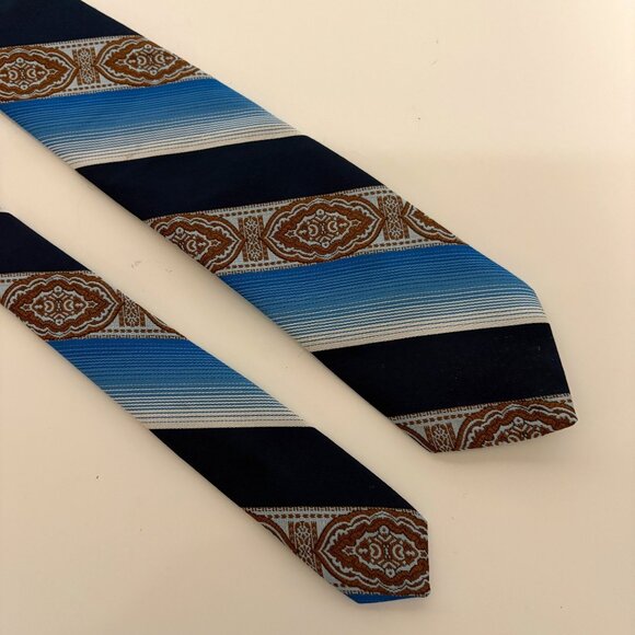 This Vintage Polyester Tie features a striking mix of blue and rust tones in an abstract striped pattern, blending classic style with retro charm. Perfect for the office, special occasions, or adding a bold accent to any outfit.