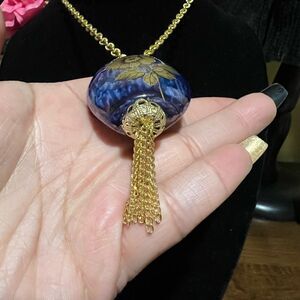 The egg shaped pomander is made of ceramic and attached to a long gold tone chain. The chain has a drop of 18" from the clasp to the bottom of the pomander.