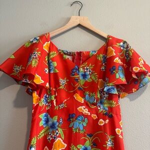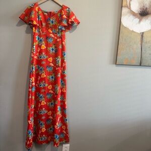 Vibrant red maxi dress with colorful floral patterns. Perfect for a bold and stylish look.