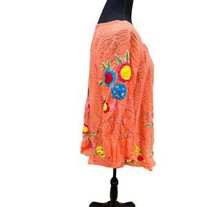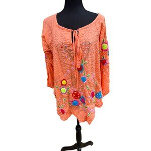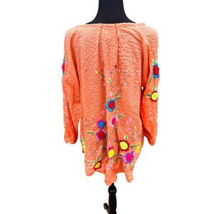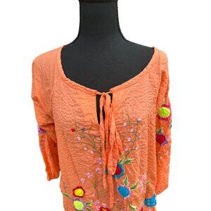 Vintage Pong Embroidered Floral Orange Tunic Top L 100% Cotton Boho Cottage Core