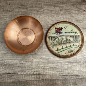 Unique travel souvenir in this lidded copper container with a painted view of Pont Adolphe with Luxembourg coat of arms. Round tin with lid and narrowing bowl, it measures approximately 4.25" diameter on the lid and sits about 1.5" tall. Impressed makers mark reads "AB" with a horseshoe.