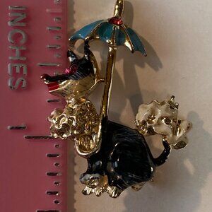 This charming brooch isn't just a piece of jewelry, it's a conversation starter. Featuring a poodle with a blue umbrella, it promises to keep your clothes dry even in the rain of compliments. Just don’t let anyone tell you it’s only for rainy days.