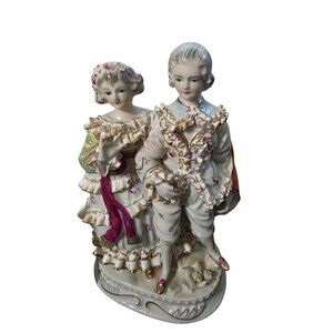 This charming porcelain figurine set showcases elegant couples in detailed Victorian-era attire. Crafted in Japan, these vintage collectibles add timeless charm to any space. Lot of three different styles vintage porcelain couples. Sizes range 4", 4 3/4" 7". Please note there is on small chips on a foot can only tell if your looking for it. Please see all photos. Open to reasonable offers and bundle deals