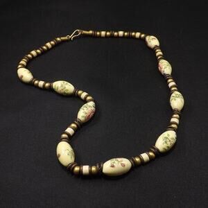 *Description: This is a beautiful beaded necklace with floral porcelain beads, brass beads, wooden beads on a leather cord from the 1970s. This is the perfect Boho necklace. It would be great as a vintage gift or to wear with your favorite outfit.