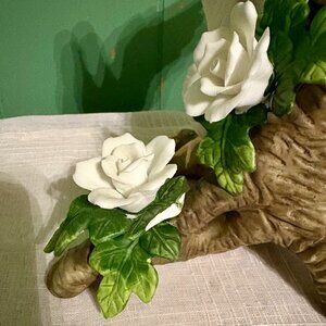This vintage porcelain bisque Wellington figurine features hand-painted white doves, perfect for all occasions and any room decor. Measuring 9.5 inches in height, this traditional-style piece was manufactured in 1990 and is part of the Wellington collection. Made in Taiwan, this collectible item weighs 1 lb 5oz and showcases intricate details of wildlife birds, specifically white doves. Its matte finish and delicate design make it a charming addition to any collection or space. One small chip in leaf on right just under bottom flower, no other chips or cracks seen in figurine. About 9" H be 9" W by 7.5" L. All felt pads are on bottom of piece. Beautiful vintage decor piece.