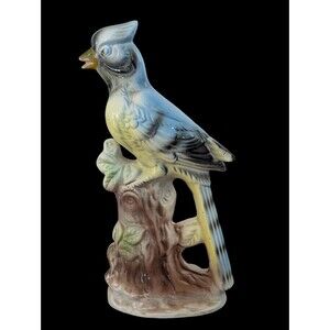 The vintage porcelain Blue Jay bird figurine from Japan stands at 10 inches tall and features intricate details of the bird perched on a stump, surrounded by leaves as it is singing. This collectible piece captures the beauty and charm of the Blue Jay bird in a delicate and elegant form, making it a unique addition to any bird or animal figurine collection. Crafted from porcelain and featuring a hand-painted design, this figurine showcases the artistry and craftsmanship of Japanese artisans. It has 2 small spots on it's left wing(not sure if it's chips) and a tiny crack on the base.