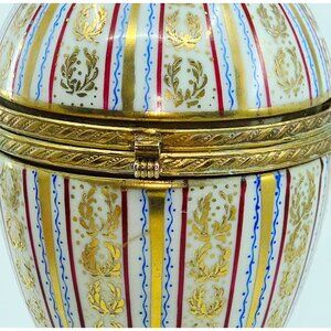 This egg is intricately designed in the style of La Tallec early 1900s. This vintage porcelain and brass egg-shaped trinket box features hand-painted stripes and gold detailing. Its hinged lid opens to reveal a simple porcelain interior, ideal for storing small cherished items. An elegant addition to any curated collection or decorative display.