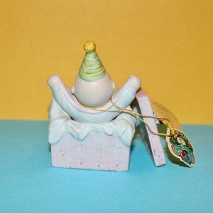 This is a cute porcelain cabbage patch kid wearing a birthday hat and sitting in a present box.