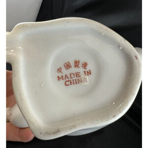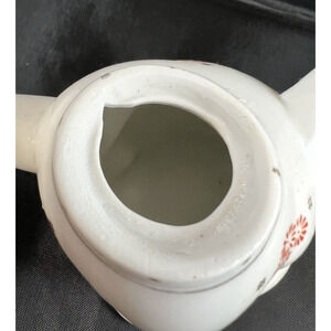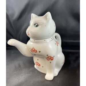 Vintage Porcelain Cat Figure Small‎ Teapot or Creamer White Red Flowers 5"