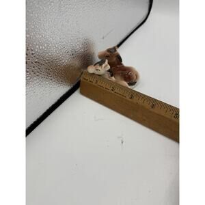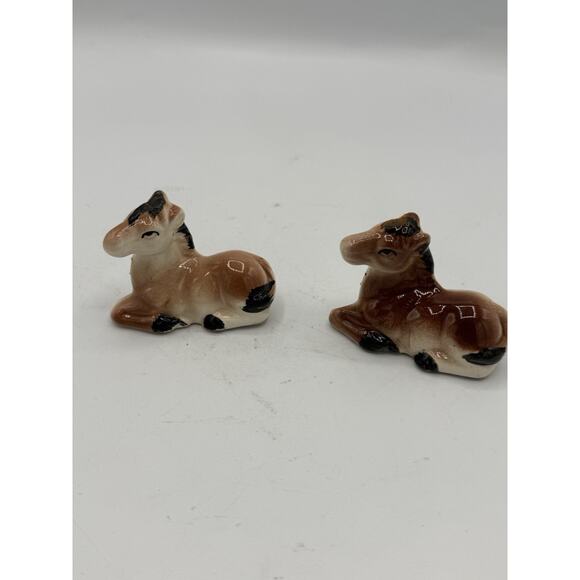dorable vintage set of 2 miniature ceramic foal figurines. These baby horses are hand-painted in brown and black with a glossy glazed finish. Perfect for collectors of mini animal figures, horse lovers, or rustic-themed decor. Please note one has a chip on the leg please examine pictures closely before purchasing