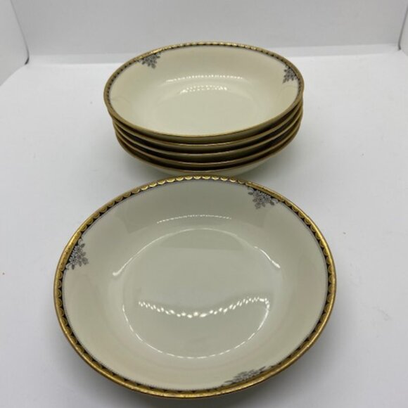 Listing a great set of 2 Community China Berkeley Square Dessert or Berry Bowls 5 1/4 diameter (approx).. These bowls are light ivory white in color with a black and gold trim around the rim with 3 floral designs within.