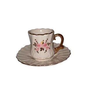 This charming vintage porcelain demitasse cup and saucer features delicate hand-painted pink roses with elegant gold trim along the scalloped edges and handle. Its dainty size and ornate detailing make it perfect for collectors, shabby chic décor, or a special gift for a tea lover.