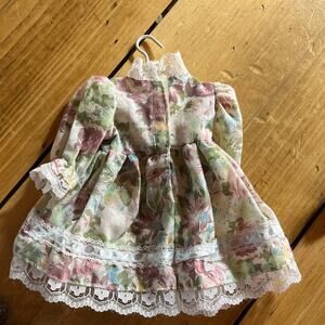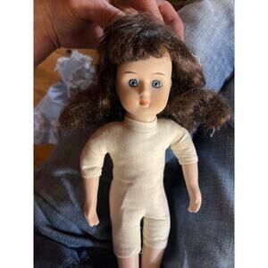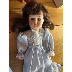 Vintage Porcelain Doll 11" Brown Hair Blue Eyes w/ 5 dresses Hats, shoes,hangers