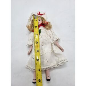 Precious blonde haired blue eyed Christmas doll. Her head, arms and legs are bisque porcelain. She is wearing a white eyelet dress and has all her clothes and is in great vintage condition. Measures 8". Would be a great ornament/decor for christmas.