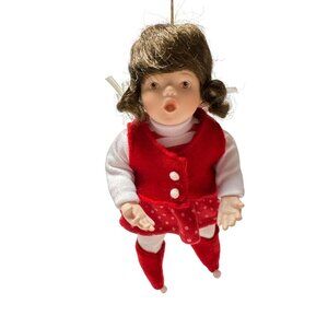 This intricately crafted porcelain doll ornament showcases delicate details, including a red polka dot dress, white tights, and a charming expression. Its classic design adds a touch of timeless elegance to seasonal decor.