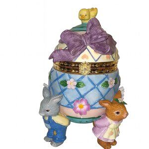 Vintage Porcelain Easter Egg Shaped Hinged Trinket Box Rabbits Bird & Flowers