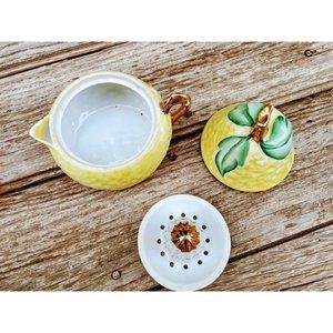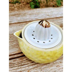 Here for your consideration is a cute little three piece porcelain juicer . It is marked Japan on the bottom. It seems to be hand painted .It measures 5" tall and about 3.5" wide. It is in good condition with a few minor flaws. there is some slight gold rubbing. There is a tiny flea nick on the inside lid as pictured. Overall, this is in good usable displayable condition.