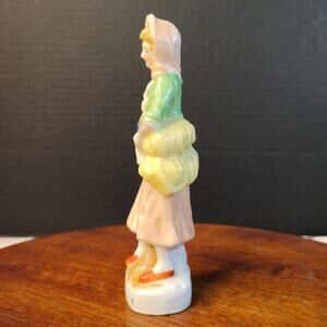 Vintage Porcelain Figurine Woman / Girl Holding Basket of Flowers & Rabbit. Measures approximately 6 1/4" tall. She's wearing a pink bonnet. Her dress is green, pink and yellow. She's carrying a basket of flowers and a rabbit. The rabbit is upside down and being carried by the back feet. Make of that what you will :) Made in Japan.