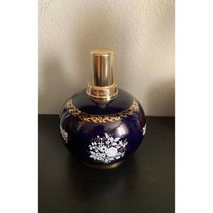 Vintage porcelain French perfume bottle / collectible Lampe Berger gift collection. Metal topper that pulls off. Can still smell the lovely scent inside. Dark blue with white flowers and gold accents. Excellent condition.