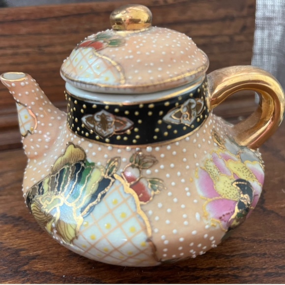Vintage Porcelain Hand Painted Floral Moriage Enameled Teapot Gold Tone Accents