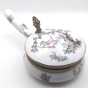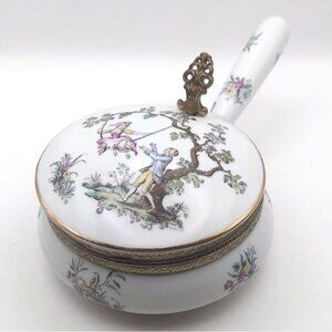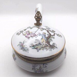 A charming vintage silent butler with a hinged lid, delicate floral designs, and romantic scene. Crafted by Andrea by Sadek, it's a fine collectible piece.