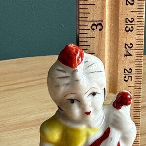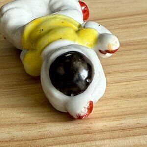 This charming vintage ceramic musician brings a whimsical touch to any space. The figure stands posed with a double bass, wearing a cheerful yellow top. The glazed finish features a classic white base with red accents, capturing a playful musical moment.