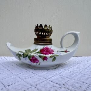 Charming porcelain oil lamp with a vibrant pink floral pattern. Features a decorative brass burner.