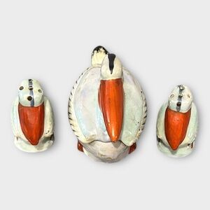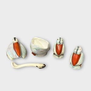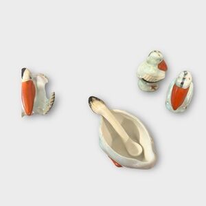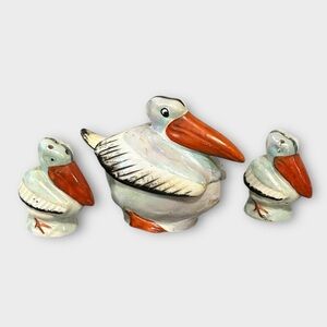 Antique set of porcelain pelicans marked Germany. Salt and pepper shakers, Mama pelican is a tiny bowl and her tail feather is a spoon. No chips or cracks, very minor paint wear from age. Mama stands about 3.5” tall.