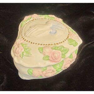 This vintage bisque porcelain, hand-painted, heart-shaped trinket box features the classic design of praying hands, surrounded by roses, often used to store small keepsakes, rings, or other trinkets. The praying hands are a classic image from days gone by but a much-needed reminder of what is so desperately needed in this modern age (my personal opinion). Please see the provided photos for further details.