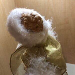 This porcelain angel tree topper features a luxurious gold gown, white faux fur trim, and soft feather wings. A timeless addition to holiday decor.