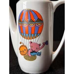 Up, up, and away! This adorable vintage porcelain teapot features a bright, playful hot air balloon carrying a lion, bear, and cat — a perfect example of cheerful 1970s–1980s whimsy in ceramic form.