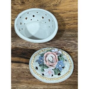 Vintage Porcelain Trinket Box Floral Rose Lid Lattice Cutout Basket Style