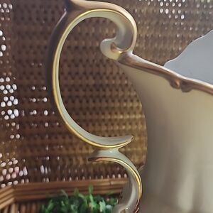 Lovely floral pitcher vase with gold tone accents around base, florals, handle, rim.